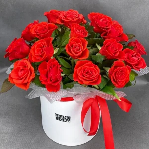 Идеальный сюрприз - коробка с красными розами и эустомой