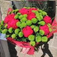 Летний, кокетливый, яркий — все сплелось в этом букете. Красные гвоздики и миниатюрные зеленые хризантемы поднимут настроение на весь день. Глядя на такой букет, невозможно не улыбаться — ведь из него пышет энергия, жажда жизни, позитив. Вы можете выбрать абсолютно любой повод, чтобы подарить это волшебство, ведь нет ничего ценнее улыбки близкого человека.