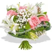 Букет из роз всегда был символом любви. Если вы только начинаете свои отношения с девушкой, и не знаете о ее предпочтениях, то лучшим вариантом будет скромный и трогательный букетик из роз розового цвета, нежной белой лилии и гипсофилы. Вкрапления с зеленью служат гармоничными акцентами в этом дизайнерском произведении. Букет невероятно стильно смотрится в вазочке белого цвета.