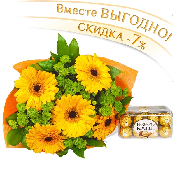Стандартный (на фото): гербера желтая - 5 шт, хризантема кустовая зеленая - 4 шт, салал, фетр оранжевый + конфеты "ferrero rocher" 200 гр.