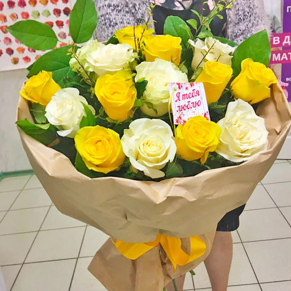 15 роз: роза жёлтая - 8 шт., роза белая - 7 шт., питтоспорум, упаковка, лента.