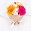 Уменьшенный: гербера микс - 4 шт., роза белая - 5 шт., упаковка, лента. Примерный размер: 20Х20 см.