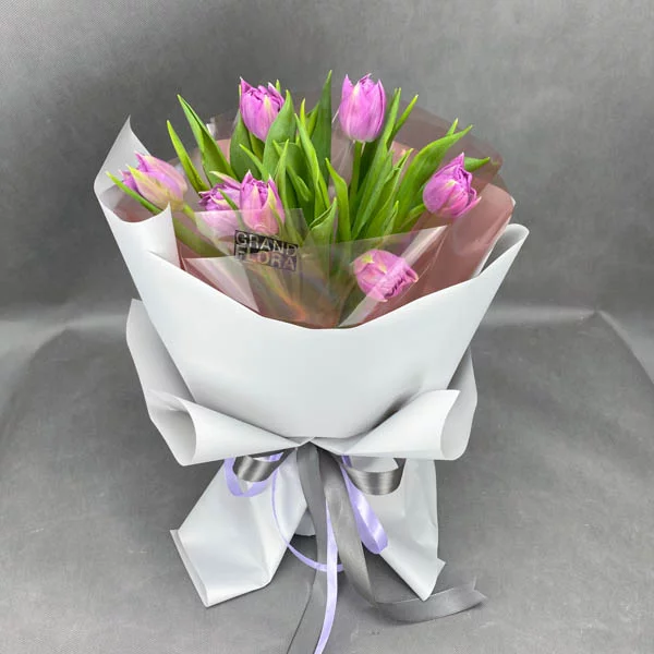 7 тюльпанов: тюльпаны розовые (розово-сиреневые) - 7 шт, упаковка, лента.